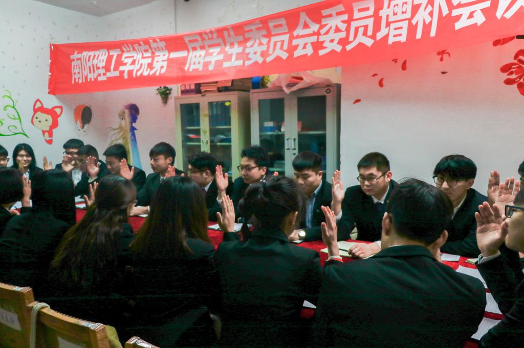 学生委员会增补大会共分四项。大会第一项,全体起立奏团歌;大会第二项,南阳理工学院学生会主席马栋宣读第一届学生委员会增补委员候选人名单,全体委员举手表决,一致同意学生委员会25名委员建议名单;大会第三项,南阳理工学院学生会主席马栋宣读第一届学生委员会增补执行主席团候选名单,全体委员举手表决,一致同意学生委员会执行主席团7名成员建议名单;大会第四项,南阳理工学院学生会主席马栋宣读确定第一届学生委员会增补执行主席名单,全体委员举手表决,一致同意马栋同学为第一届学生委员会的增补委员执行主席;最后,大会在同学们热烈的掌声中落下了帷幕。
