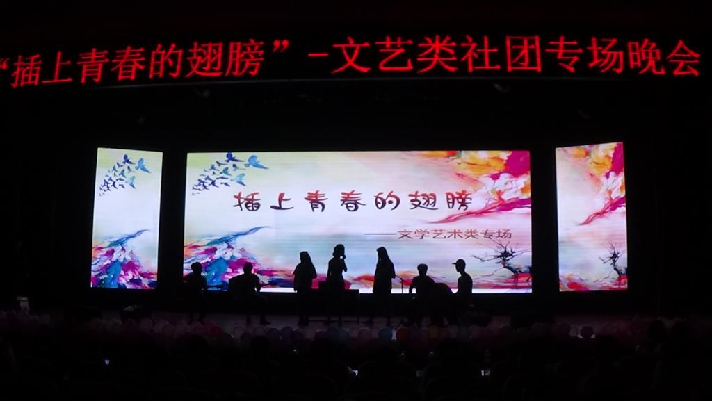 5月13日,文学艺术类专场晚会——“插上青春的翅膀”在毕业大厅倾情上演。此次专场晚会是本届社团文化节的重头戏,精心备至的前期准备结合各优秀社团现场美轮美奂的节目为现场的观众献上一场视听盛宴。其中独唱《春暖花开》清新暖心的旋律最为亮眼,幽默且另类的舞台剧《动漫角色乱斗》将整场晚会推向高潮,引得现场观众欢呼掌声不断,舞蹈《I Like That》和小品《唐朝美人》等其他精彩的节目也都给观众留下了深刻的印象!