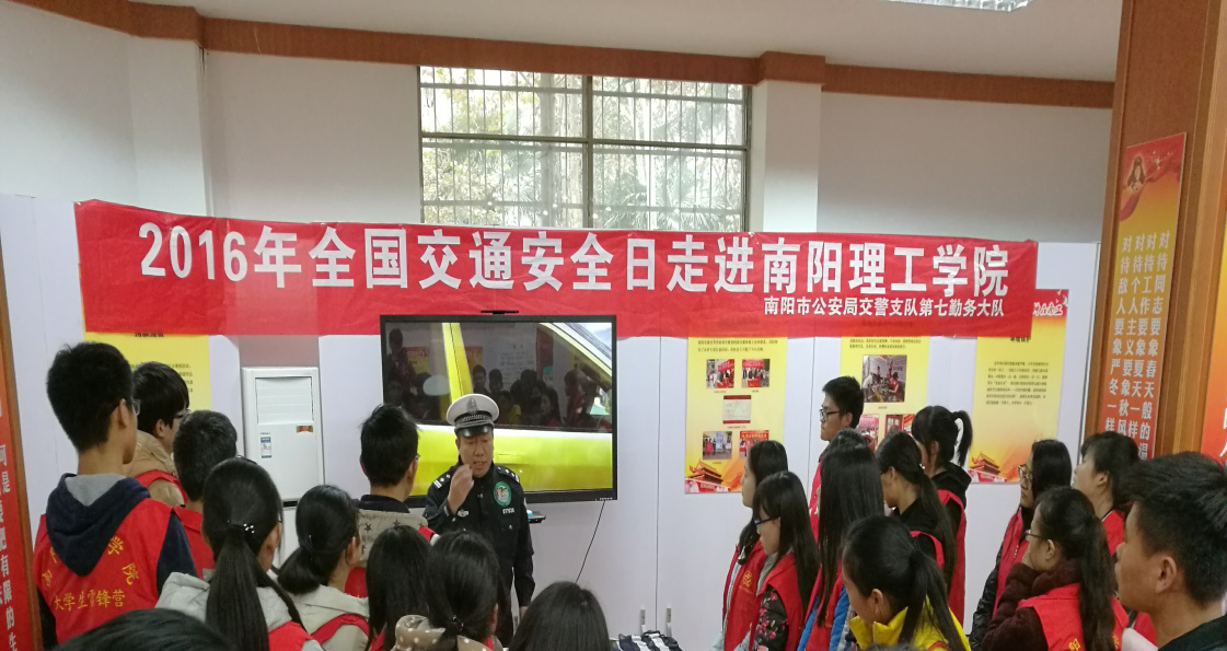 12月2日是全国交通安全日,南阳市公安局交警支队第七勤务大队携手大学生雷锋营在校雷锋营展馆开展“2016年全国交通安全日走进南阳理工学院”活动,为同学们普及交通安全知识,培养同学们的文明交通、安全交通意识。