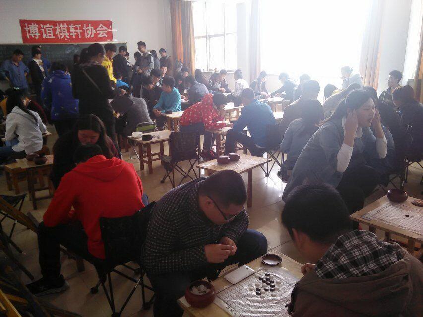 十点整,比赛正式开始。各组选手认真应战,比赛格外精彩。而一旁的裁判也认真观察战局动向,力求做到公平公正,对参赛者负责。此次各参赛团体实力不凡,屡有和局情况出现。经过一上午角逐,比赛前四轮成绩已经公布,下午在一点整进行后三轮比赛,下午比赛开始后,气氛愈加紧张,各参赛选手均全神贯注,力争胜利;并且相对于上午的比赛,各组选手博弈时间也明显增加,每步棋更是深思熟虑,比赛在三点半结束,为比赛公平,博谊棋轩协会成员参加比赛但不获得此次比赛的名次以及奖品,以此鼓励各社团派团体代表以及个人代表参加。