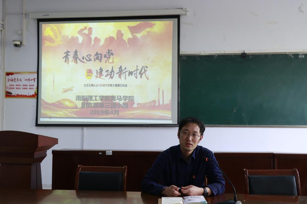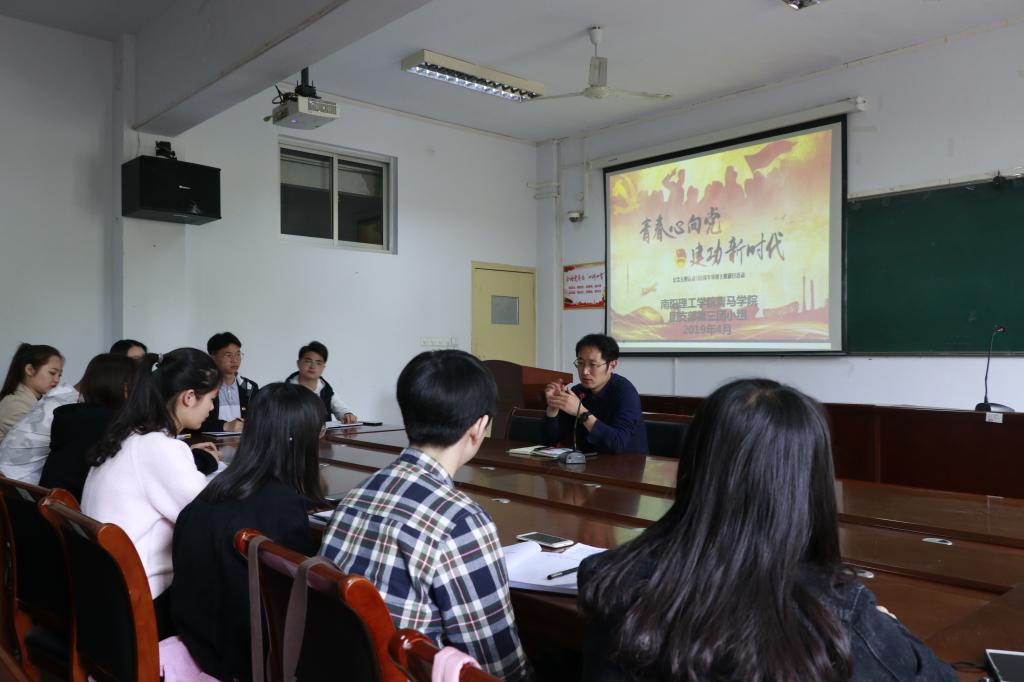 第三团小组在会前与校团委书记康磊一同观看由团省委主办、洛阳师范学院承办的河南省“青马工程”培养班“青春心向党·建功新时代”主题团日活动的网络直播。组员们通过观看直播,领略了省青马优秀成员的风采,重温了热血沸腾的入团誓词。随后,大家轮流讲述对本次会议主题的感悟,康磊用自己的亲身经历告诉大家每一代人都有每一代人的使命 。