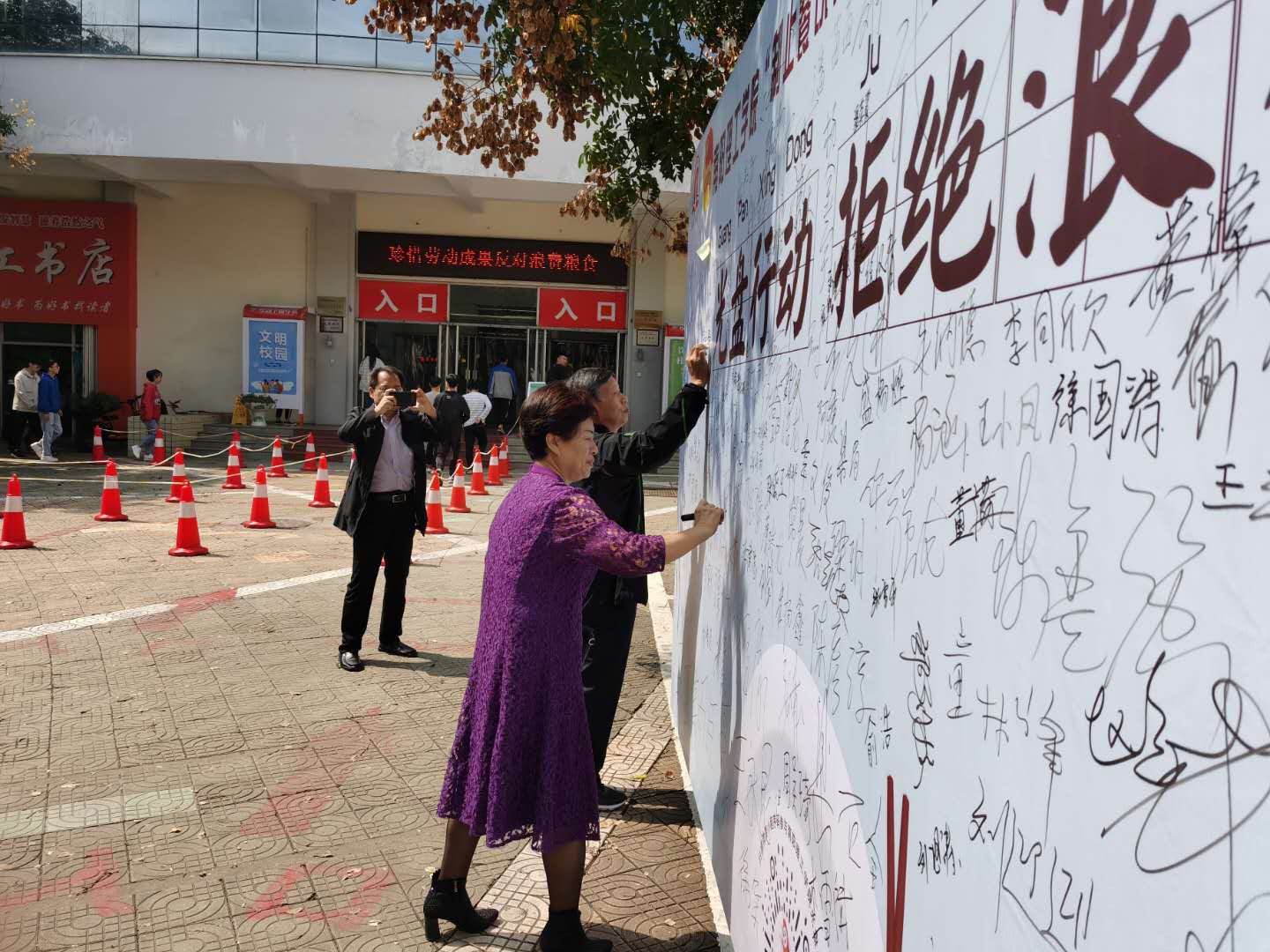 本网讯(特约记者/陈飞 学生记者/李尚雨)近日,我校团委主办,学生社团联合会承办的“制止餐饮浪费,厉行勤俭节约”主题教育签名活动在学苑餐厅、南苑餐厅门前举行。校党委书记刘荣英出席活动并签名,团委、后勤管理处负责人以及500余名学生代表参加此次活动。