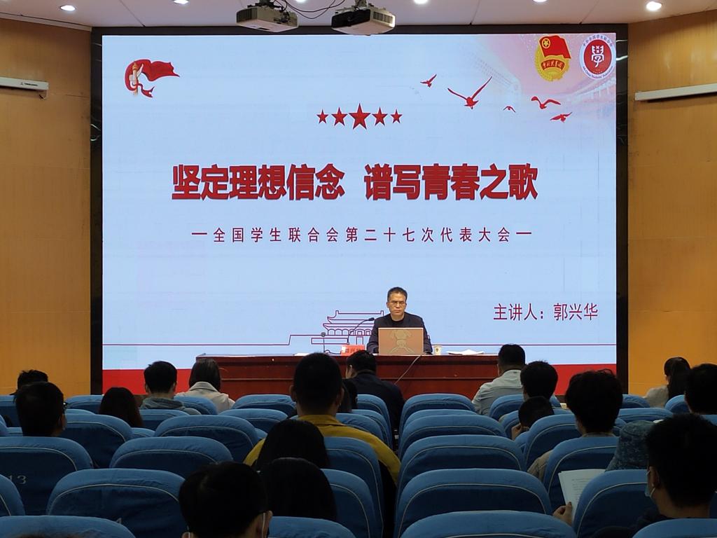 随后,郭兴华作了题为《坚定理想信念 谱写新时代的青春之歌》的专题辅导,从大会概况、习近平总书记贺信精神、党中央致词精神、贺军科和郑富芝讲话精神与大会工作报告等方面进行深入解读。同时,根据校党委的要求,对我校学生会改革提出意见和建议,做出了具体安排部署。
