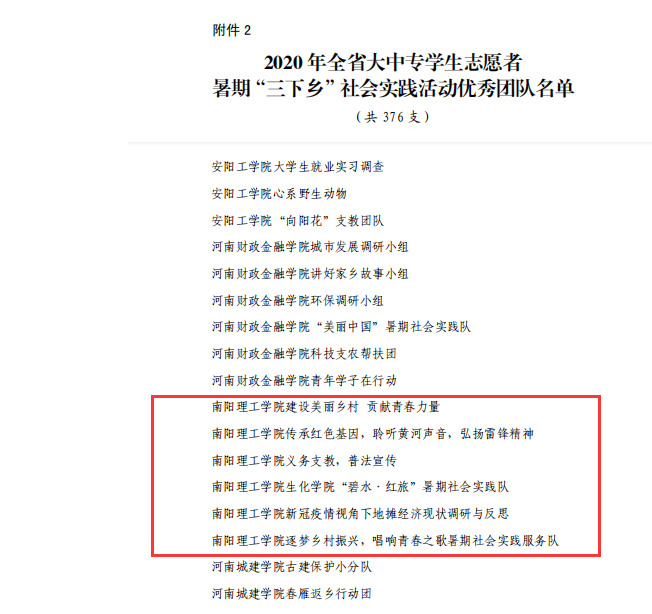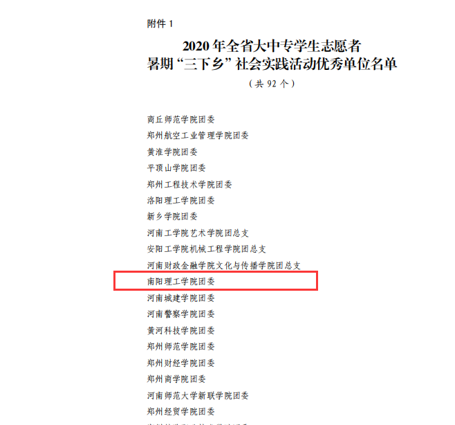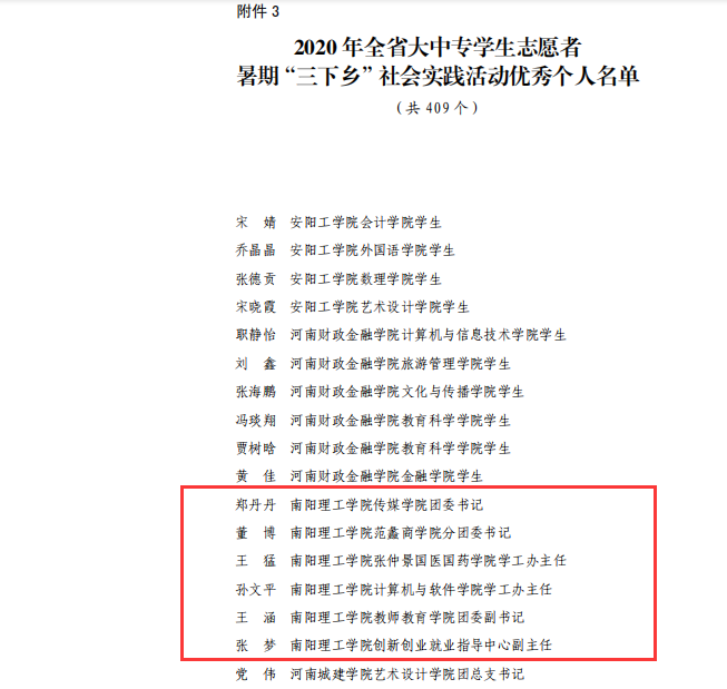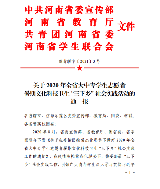 近日,省委宣传部、省教育厅、团省委、省学联联合发布《关于2020年全省大中专学生志愿者暑期“三下乡”社会实践活动的通报》,经基层申报、高校团委推荐、团省委审核把关、组织评议、结果公示等环节,校团委荣获2020年河南省大中专学生志愿者暑期“三下乡”社会实践活动优秀单位;“建设美丽乡村 贡献青春力量”等六个团队荣获2020年河南省大中专学生志愿者暑期“三下乡”社会实践活动优秀团队;郑丹丹等六名老师荣获2020年河南省大中专学生志愿者暑期“三下乡”社会实践活动优秀个人。