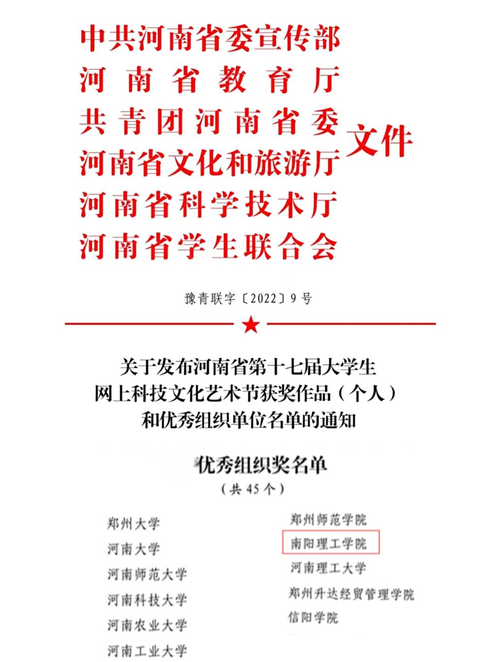 本网讯(特约记者/杨双)近日,从河南团省委获悉,在由河南省委宣传部、省教育厅、共青河南省委、省文化厅和省学生联合会联合举办的河南省第十七届大学生科技文化艺术节系列竞赛中,我校36项作品获奖,其中一等奖8项,二等奖9 项,三等奖9项,并荣获优秀组织奖,陈硕等6位老师被评为优秀指导老师。