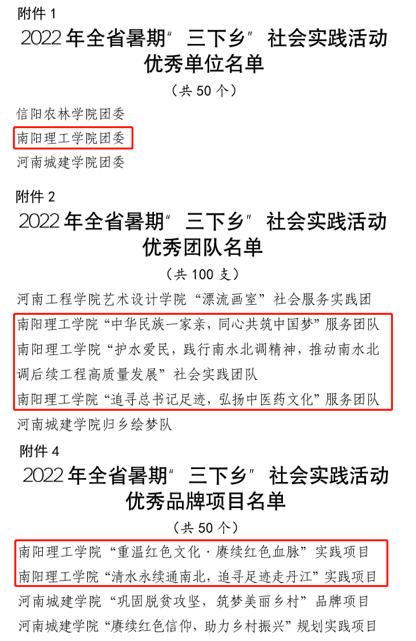 2022年暑期“三下乡”社会实践活动校团委高度重视,系统开展社团实践团队培训工作,认真遴选优秀社团实践团队,引导师生端正态度,发扬吃苦耐劳、踏实肯干的作风,怀着不负青春,不负韶华,不负时代的殷切期望,组建37支社会实践专项团队,围绕红色文化、南水北调、沿黄河流域、弘扬仲景文化、关爱留守儿童、乡村振兴等8个方面,开展了一系列主题鲜明、形式新颖、内容丰富的暑期社会实践活动,被中青网、新华网、今日头条等线上媒体报道256篇;被南阳日报、文明南阳、半月谈等市级以上纸媒报道180余次;校主页、校官微、团委官微推出系列报道32期,得到社会各界和广大群众的一致认可和好评。(校对/王文博 审核/郭兴华)