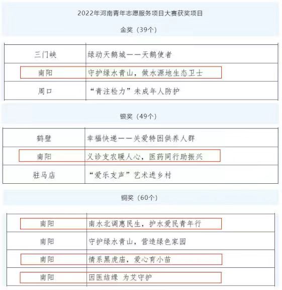 本网讯(特约记者/程斐)近日,从团省委获悉,我校在第六届中国青年志愿服务项目大赛河南区选拔赛暨2022年河南青年志愿服务项目中获得了一金一银三铜的好成绩。我校生物与化学工程学院《守护绿水青山,做水源地生态卫士》和张仲景国医国药学院《义诊支农暖人心,医药同行助振兴》项目分别荣获金奖和银奖。