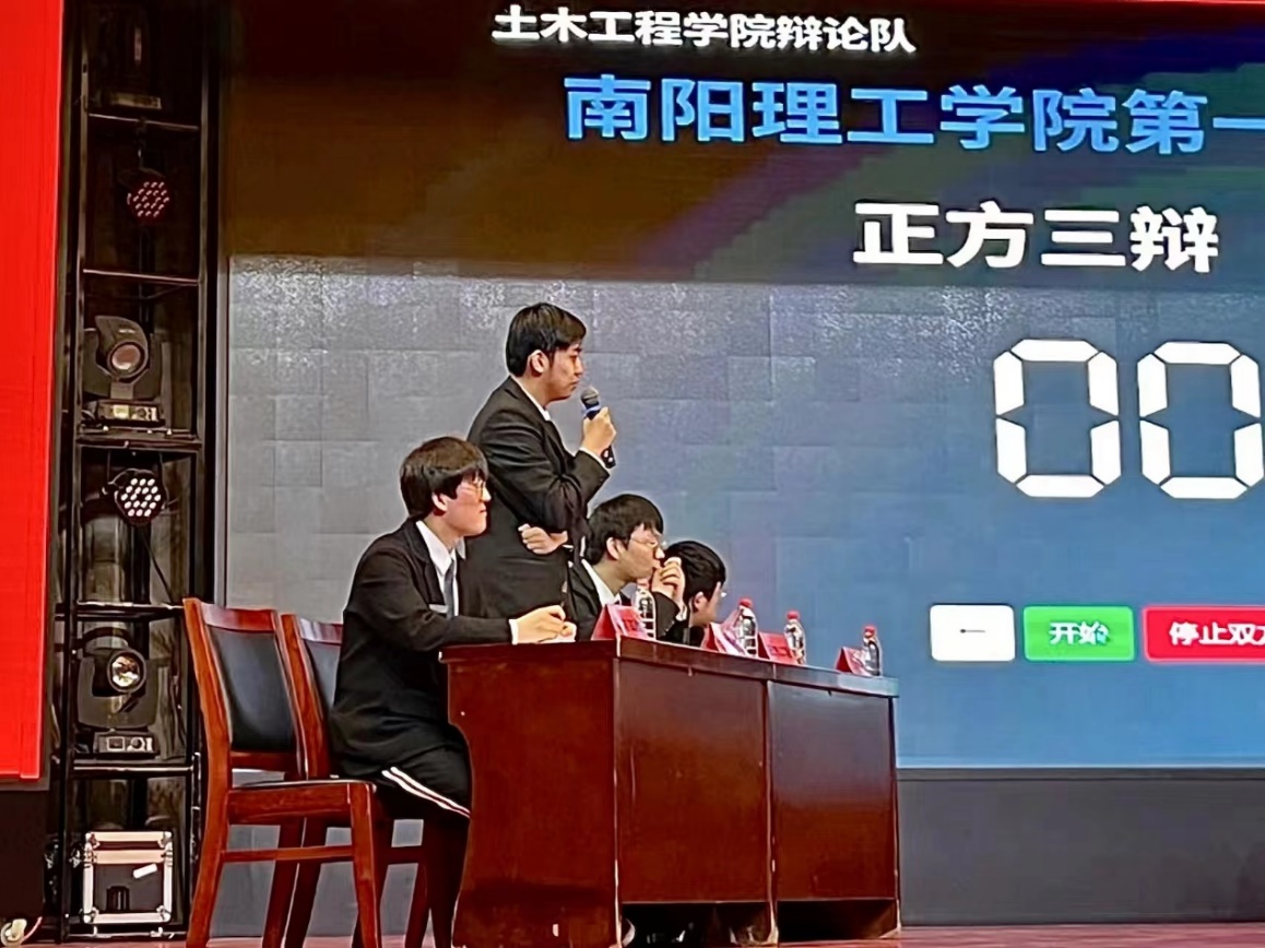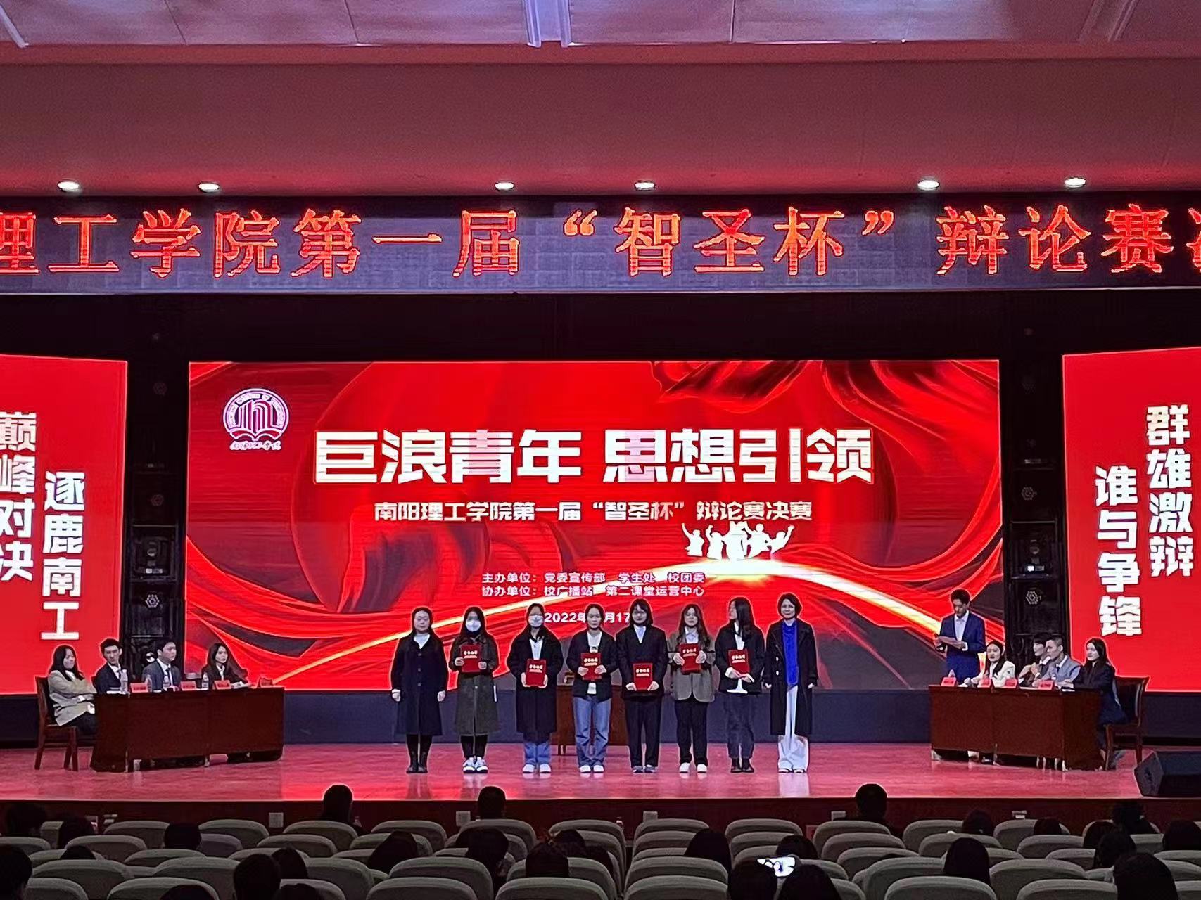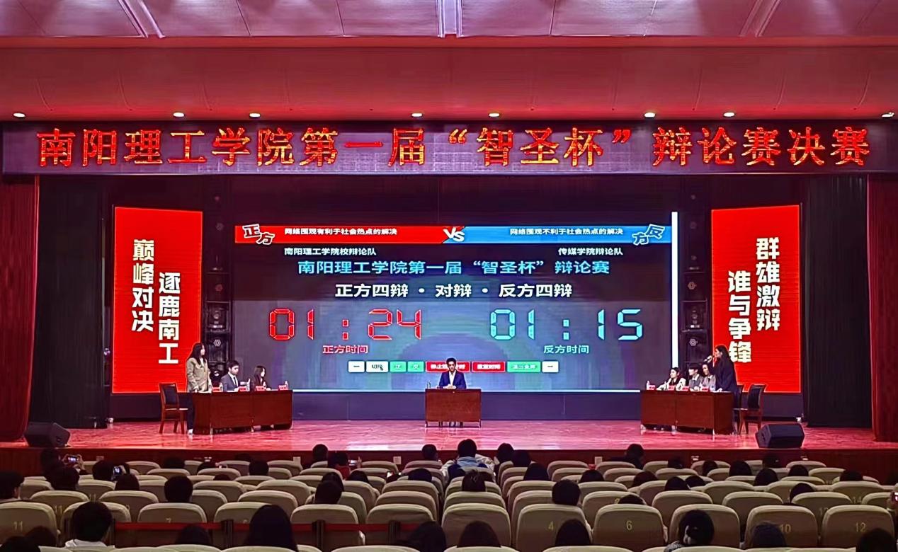 本网讯(记者/马婧媛)2022年11月17日晚19:00,南阳理工学院第一届“智圣杯”辩论赛决赛于我校毕业大厅隆重举行。比赛由南阳理工学院校辩论队对阵传媒学院辩论队,学生处处长路瑞峰老师、团委书记郭兴华老师、党委宣传部副部长肖邓华老师、心理健康中心副主任余瑞玲老师和团委副书记程斐老师担任评委,最终校辩论队赢得了比赛。