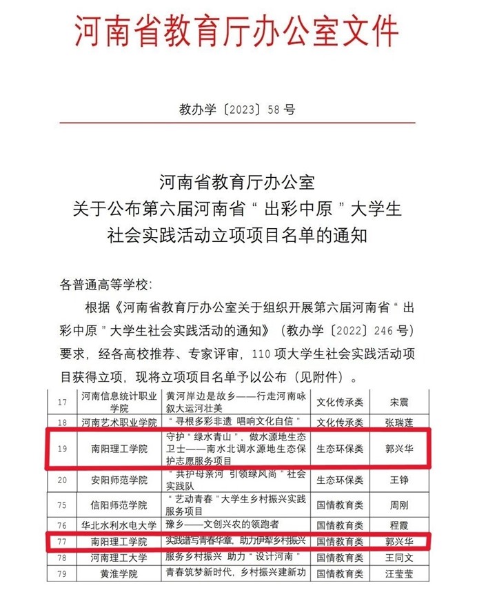 本网讯(特约记者/王文博)近日,河南省教育厅印发《关于公布第六届河南省“出彩中原”大学生社会实践活动立项项目名单的通知》,我校智能制造学院申报的《实践谱写青春华章,助力伊犁乡村振兴》和生物与化学工程学院申报的《守护“绿水青山”,做水源地生态卫士——南水北调水源地生态保护》两个项目成功获省教育厅立项。