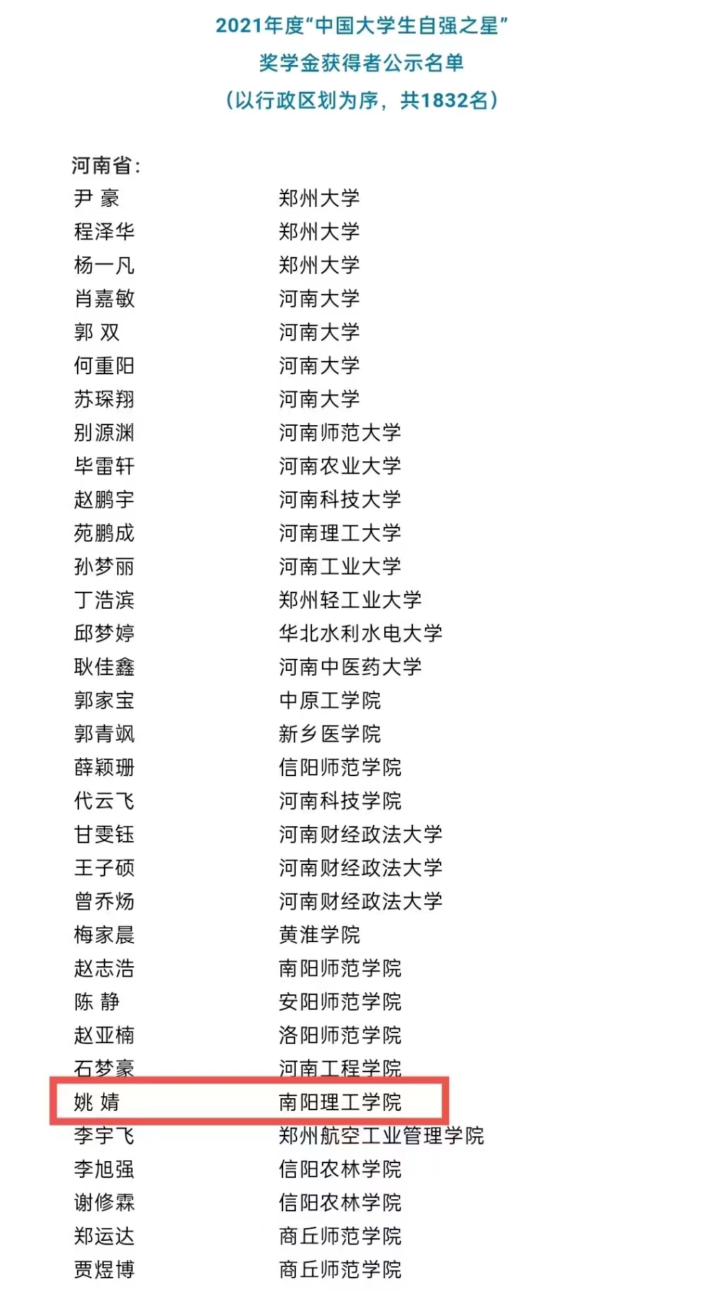 近日,我校生物与化学工程学院姚婧同学荣获由共青团中央、全国学联共同组织评选“中国大学生自强之星”奖学金。
