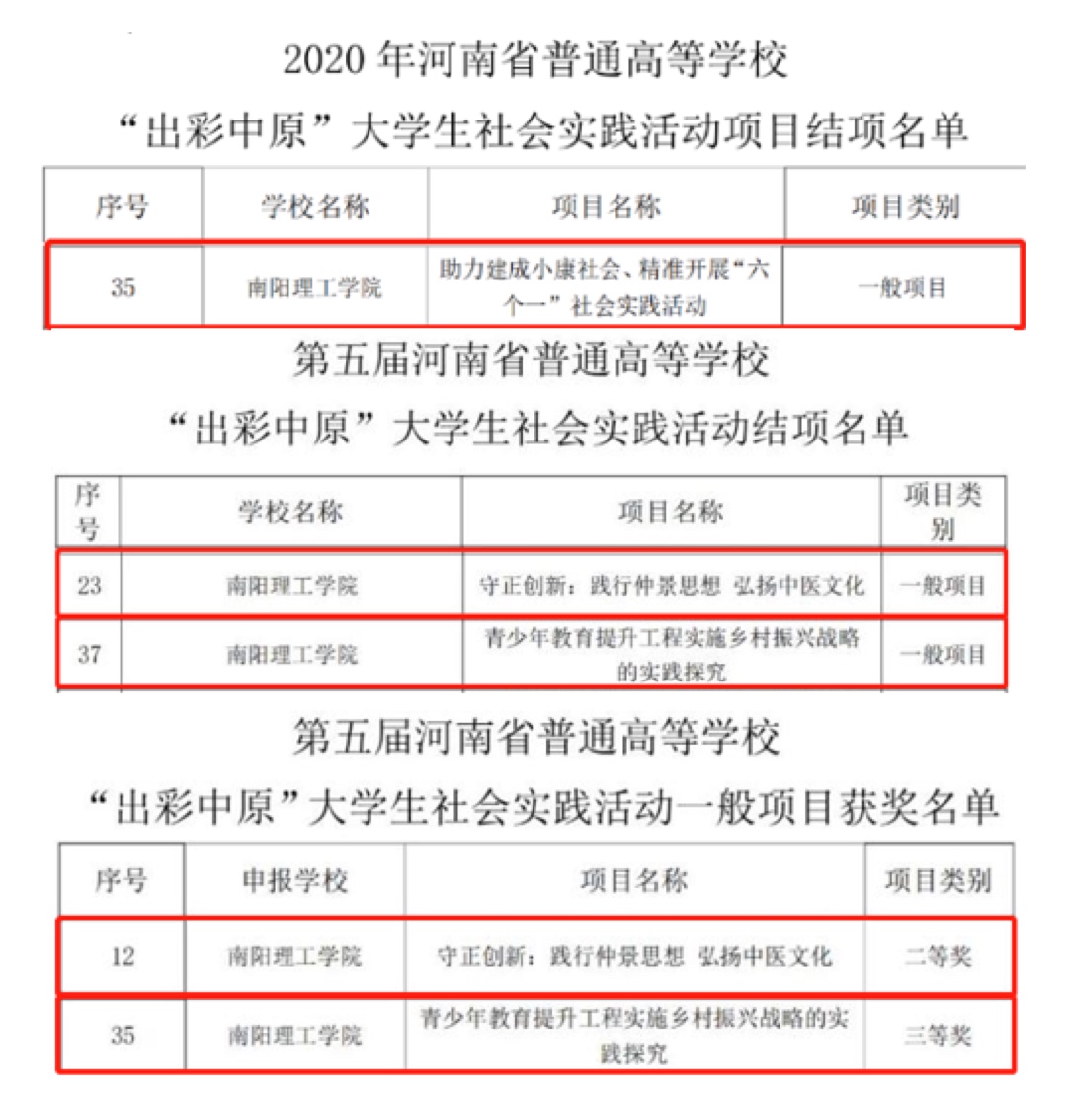 其中,我校申报的《助力建成小康社会,精准开展“六个一”社会实践活动》在2020年河南省普通高等学校“出彩中原”大学生社会实践活动中顺利结项,《守正创新:践行仲景思想 弘扬中医文化》项目和《青少年教育提升工程实施乡村振兴战略的实践探究》项目在第五届河南省普通高等学校“出彩中原”大学生社会实践活动中顺利结项,同时分别获得二等奖和三等奖。(校对/袁思源 审核/郭兴华)