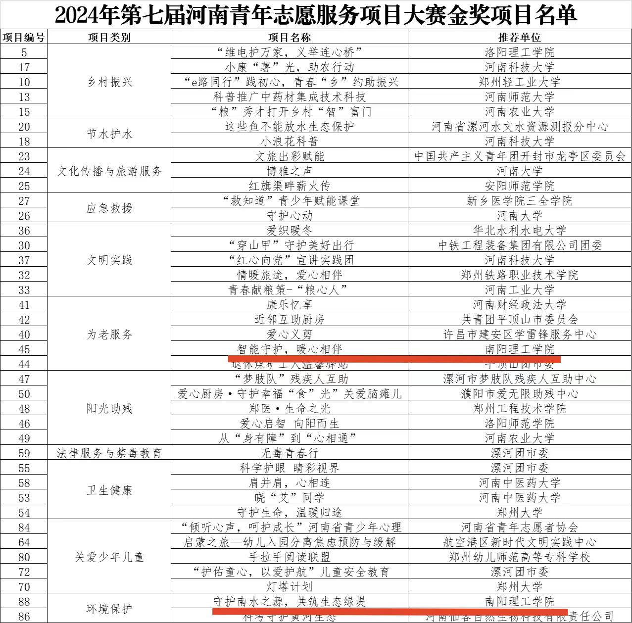 本网讯(特约记者/尹卓然)9月9日,由共青团河南省委、省委社会工作部、省民政厅、省水利厅、省文化和旅游厅、省卫健委、省残疾人联合会联合举办的第七届河南青年志愿服务项目大赛在河南饭店开赛,我校《智能守护,暖心相伴》和《守护南水之源,共筑生态绿堤》两个项目荣获金奖。