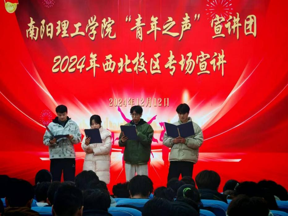 本网讯(学生记者/赵一龙)12月12日下午,南阳理工学院“青年之声”宣讲团2024年西北校区专场宣讲在领创空间报告厅举行,各学院300余名团员青年参加本次活动。