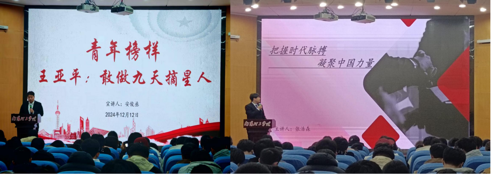 宣讲团成员张浩森以为主题“把握时代脉搏,凝聚中国力量”主题,阐释了在新时代背景下青年人要以满腔热血投身国家建设;安俊丞讲述了“青年榜样王亚平——敢做九天摘星人”的故事,以王亚平的勇敢追梦激励每位同学勇于挑战自我,书写奋斗青春;刘新宇以“青春心向党,奋斗新时代”为主题,引导同学们将个人成长融入党和国家的伟大事业中;杨梦思同学聚焦“传承红色精神,赓续红色基因”,带领同学们从红色文化中汲取奋进力量。