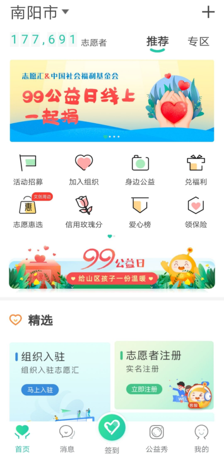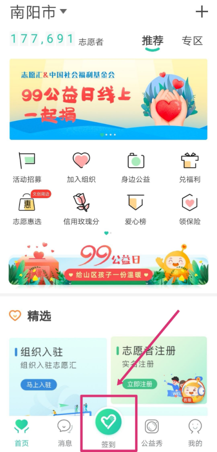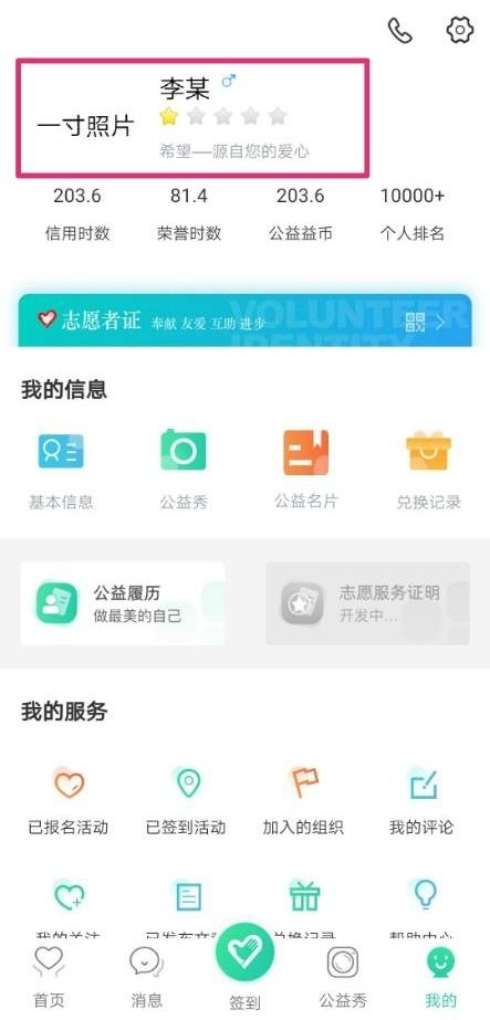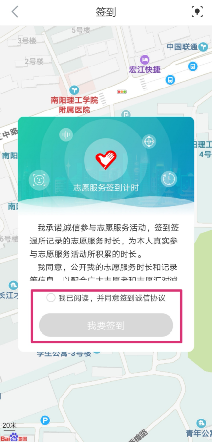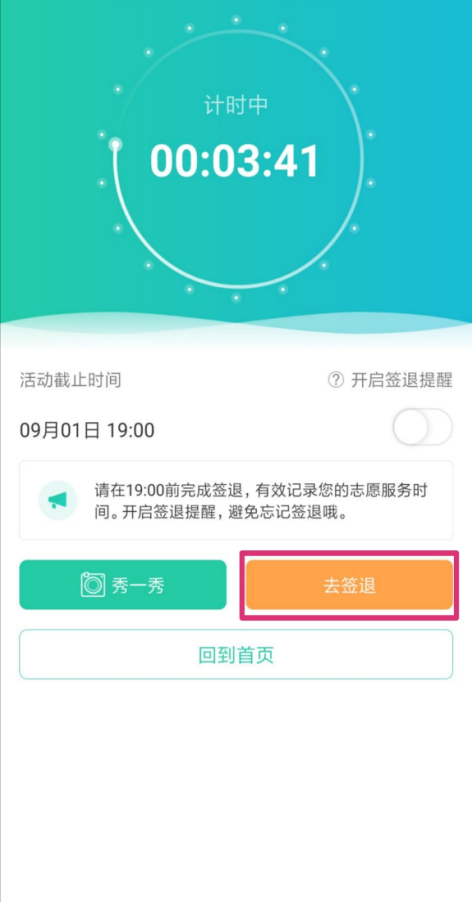 6.活动签到:“首页”点击签到→勾选“签到诚信协议”→输入活动编码→系统自动开始计时,并且在活动截止时间之前再次进入页面签退,才能记录相应的服务时长。