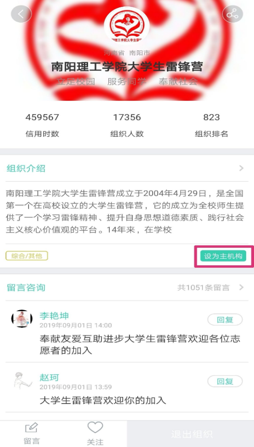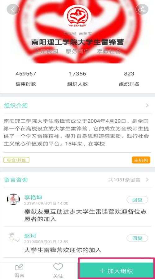 5.加入组织:在首页点击“加入组织”,搜索“南阳理工学院大学生雷锋营”及“本学院雷锋连”的组织。打开后点击右下角“加入组织”并将 南阳理工学院大学生雷锋营 设置为“主机构”
