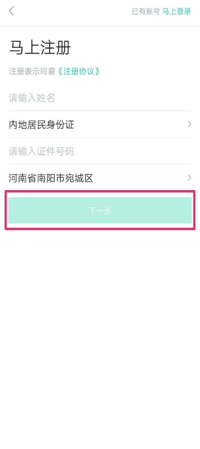 (1)填写完相关信息后点击“下一步”,如左图。 填写真实姓名且需与身份证一致,地区选择河南省南阳市宛城区。