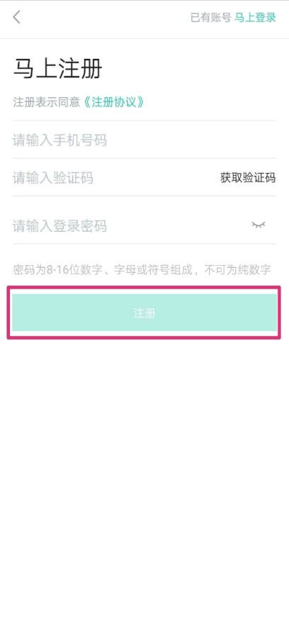 (2)使用手机号进行验证,设置登录密码,点击注册,如右图。