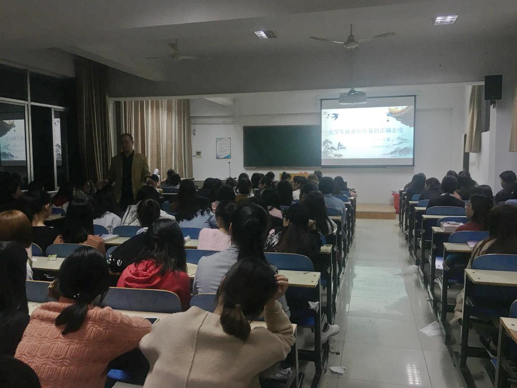 本网讯(特约记者:王同斌 学生记者:宋珊珊)4月16日,张仲景国医国药学院于11#507教室举办以“大学生就业应具备的正确态度”为主题的就业指导讲座,团学办公室主任王猛担任主讲老师,约150名2018届毕业生参加。