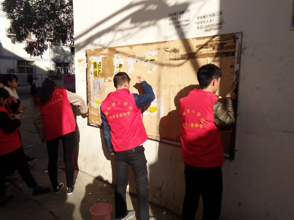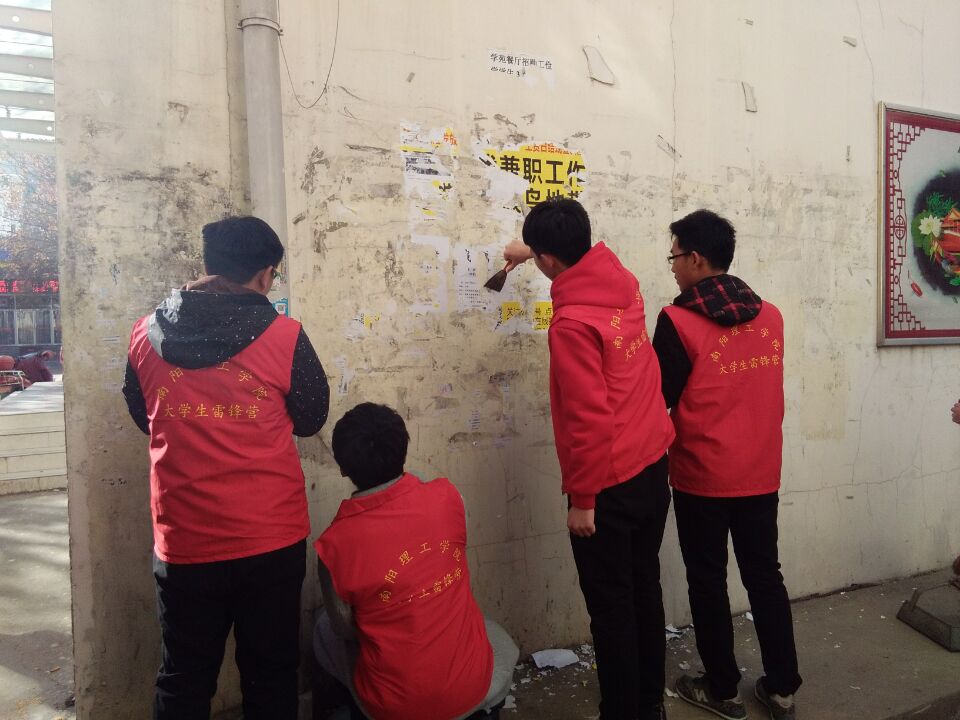 (宣传部文/刘园园 图/刘园园)为制止校园小广告泛滥,恢复校容,还给师生们一个良好的生活学习环境,12月10日下午,土木工程学院举办“啄木鸟”-清理小广告活动。本次活动由学生会雷锋连主办,十几名志愿者参与了活动。