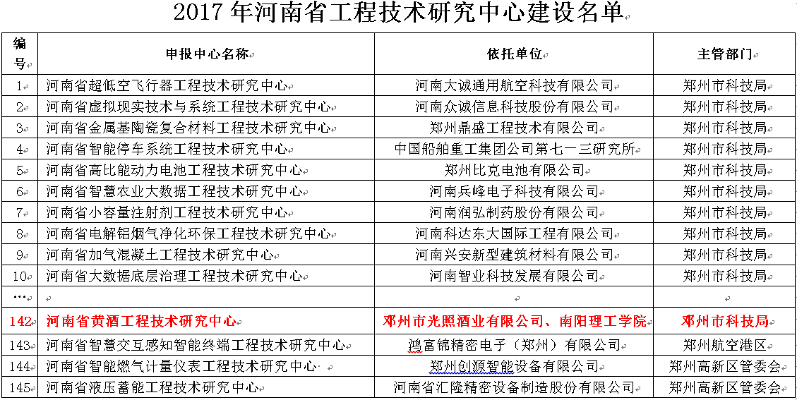 本网讯(特约记者:李慧星)12月28日,河南省科技网(http://www.hnkjt.gov.cn)发布通知公告,我校与邓州市光照酒业有限公司共同申报的“河南省黄酒工程技术研究中心”获河南省科学技术厅批准建设,这是我校获批的第一个省级工程技术研究中心。