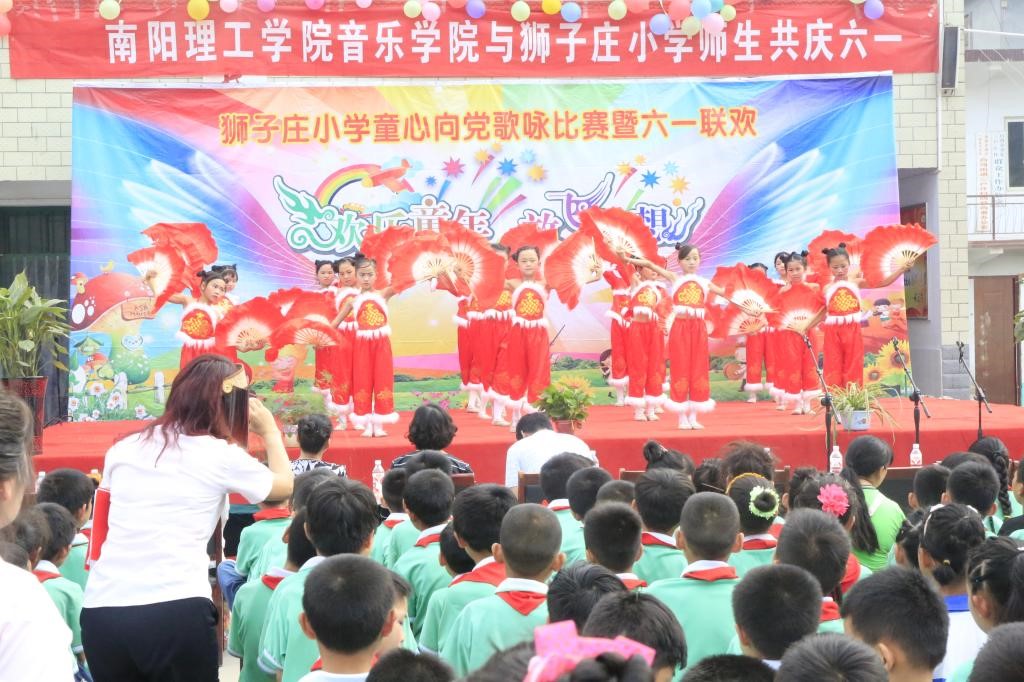 南阳理工学院工会副主席吕书会、音乐学院党总支书记冯建等人与狮子庄小学300余名师生共同观看节目。