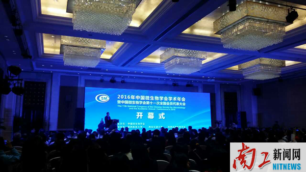 本网讯(特约记者/田永磊 臧晋 校对/王亚迪 编审/岳小玲)由中国微生物学会主办,第四军医大学、西安交通大学、陕西省微生物学会共同承办的,以“微生物与绿色发展”为主题的2016 年中国微生物学会学术年会暨中国微生物学会第十一次全国会员代表大会,于 2016 年 10 月 28日—31日在陕西省西安市举行。中国微生物学会理事长邓子新院士莅临会议并致辞。来自全国从事微生物学研究、 教学和开发的专家、学者1500余人到会。与会专家、学者在会上进行了学术交流和研究成果展示。我校生化学院院长郭书贤、发酵工艺教研室主任臧晋应邀参加会议。