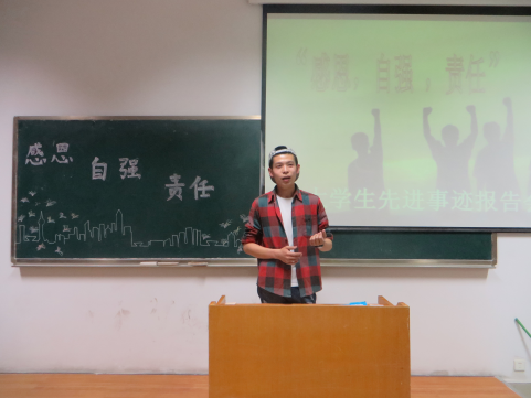 本网讯(学生记者/解灿灿 摄影/黄宇)为给大学生树立良好榜样,激发15级学生学习动力,5月30日,我院于11#616举行“感恩、自强、责任”主题报告会。本次报告会由学生代表姜春旭、黄南、王茹担任主讲人,100余名学生共同聆听报告会,现场座无虚席。