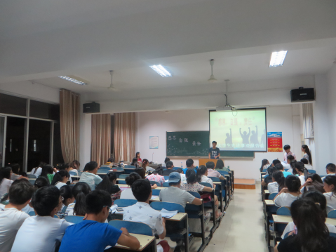 报告始前,工作人员以播放ppt形式为同学们展现他们个人风采。作为12级学生会主席,姜春旭首先上台发言,他用诙谐的语言与场下同学互动,营造一种轻松活跃的气氛。他首先问道:什么是责任?对于责任的理解他抛出六字真言——在其位,谋其职;什么是自强?他讲述自己参加国旗护卫队和台湾交换生的大学经历,在被拒绝的情况下依然保留念想,以亲身经验告诉同学们有些事情要靠自己争取,凡事没有绝对;演讲结束后,同学们纷纷举手发问,在被问到如何面对困难时,他说到:车到山前必有路,但前提一定要有车,才能长驱直入。他巧妙的回答赢得同学们高度赞同和热烈掌声。随后,13级副主席黄南、王茹先后为同学们作报告,讲述他们取得现有成就的秘诀。