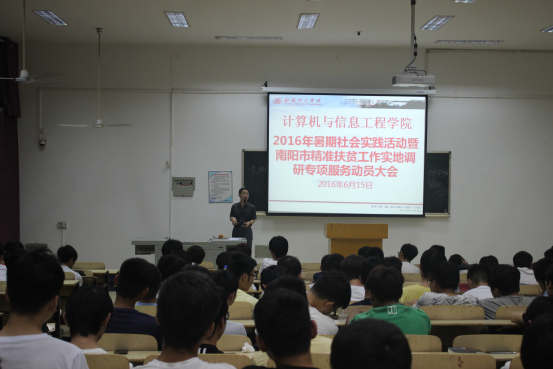 本网讯(特约记者/丁欢)6月15日晚,计算机与信息工程学院在7号楼101教室召2016暑期社会实践活动暨南阳市精准扶贫工作实地调研专项服务动员大会。