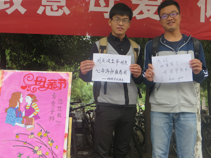 早上9点活动正式开始,活动规则为参与活动的学生在提供的纸张上写下对母亲的祝福,并尽可能提供一张与母亲的合照,便可获得小礼品一份。活动伊始,路过的学生们陆续在纸上写下对母亲的祝福语。一位同学自创一句诗“月五风尘节母亲,心吾满怀情感恩”来表达对母亲的感恩;也有同学深情表白“你用青春换我健康成长,愿你永远快乐,青春常在”,;也有同学用欢快的词语表达对母亲的爱“最幸运的事:我已长大,你还未老”,“陪伴是最长情的告白”。