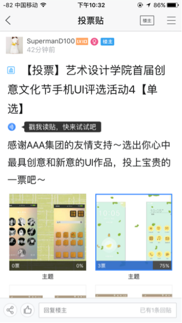 UI即User Interface(用户界面)的简称。UI设计是指对软件的人机交互、操作逻辑、界面美观的整体设计。好的UI设计不仅是让软件变得有个性有品位,还要让软件的操作变得舒适简单、自由,充分体现软件的定位和特点。活动期间,通过百度贴吧(南阳理工学院吧)、新浪微博等网络平台将作品张贴挂在网上让广大网友们投票,通过最后投票数量,点赞数量的统计,评选出大家最钟意的UI设计。