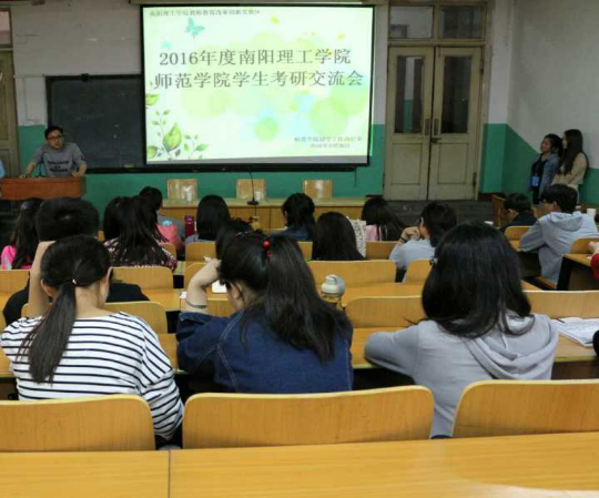 (本网讯/通讯员:朱丹)为进一步加强同学们对研究生入学考试的认识、营造积极向上的学风,2016年4月28日下午,我院在师范大讲堂举办了“2016年度南阳理工学院师范学院学生考研经验交流会”。参加会议的有师范学院党委副书记 李勇、团学工作办公室主任陈飞及各专业辅导员。