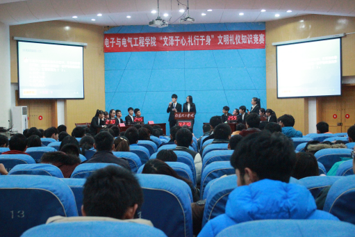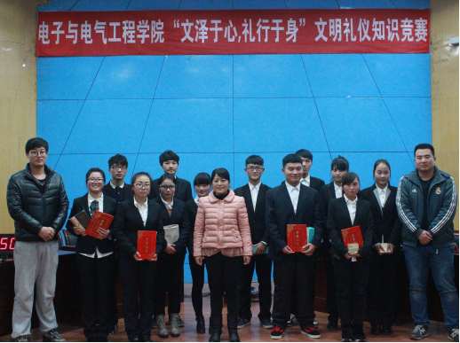 本网讯(学生记者/鲍雪 王续然)11月27日晚,电子与电气工程学院在图书馆二楼报告厅举办“文泽于心,礼行于身”文明礼仪知识竞赛的决赛。电子与电气工程学院分团委书记田娜、13级辅导员张子正、15级辅导员王闯出席本次活动,15级全体学生参加此次活动。