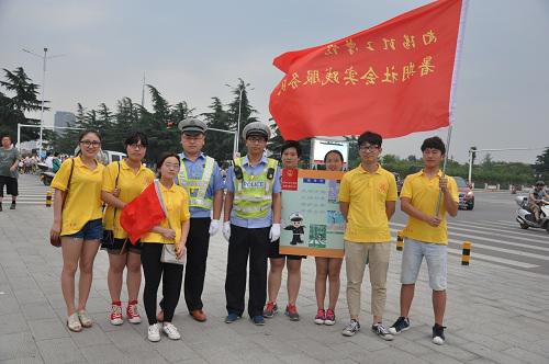 本网讯(学生记者/伍惠苹)2015年7月3日,我校机械与汽车工程学院大学生社会实践服务队一行21人,到南阳市各交通繁忙路口协助交警队员指挥交通,宣传“文明交通,平安出行”的重要性。