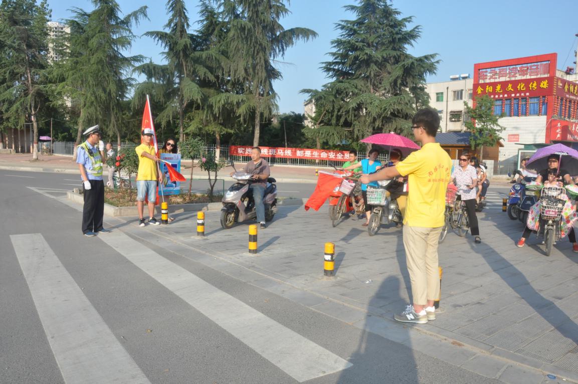 队员们冒着炎炎夏日跟随交警队员们来到人流量较大的3个路口积极开展协警工作。利用宣传海报和宣传横幅耐心地向路人普及交通安全知识;按照交警指示,队员们用小红旗来引导路人正确过马路。