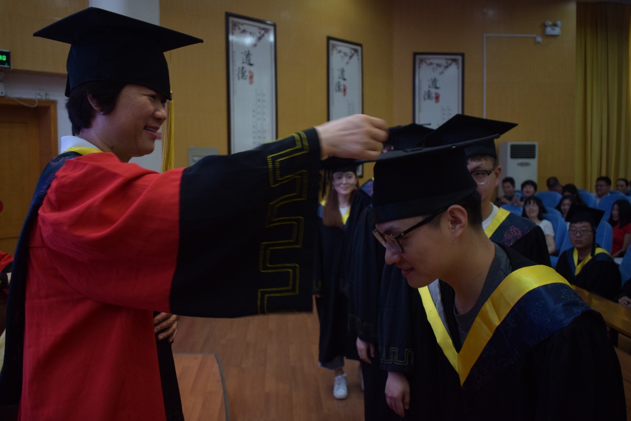 毕业生们身着整齐的学士服,头戴学士帽,井然有序地上台接受学位授予。院长陈孝珍教授为获得学士学位毕业生扶正流苏,当毕业生学士帽的流苏一个个从帽沿右侧被扶到左侧时,场下老师和同学都心情激动,掌声久久不断。