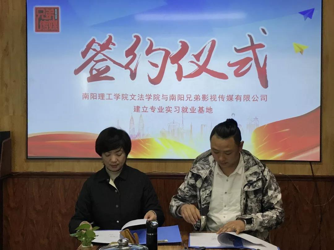 仪式上,李慧院长与王康康签署专业实习就业基地共建合作协议书,并为南阳兄弟影视传媒有限公司进行了南阳理工学院文法学院实习基地授牌。
