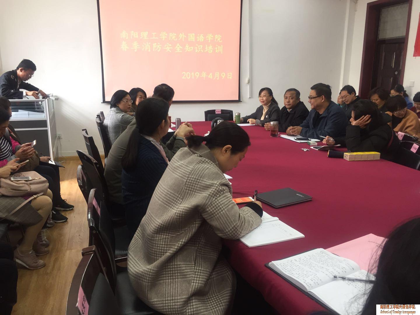 为切实加强学院的消防安全管理,普及消防安全知识,进一步提升广大教师的消防安全意识。2019年4月9日下午,外国语学院特邀请河南省消防协会成员黄教官为我院教师进行春季消防安全知识培训。