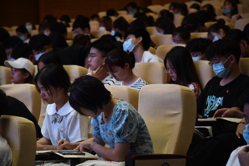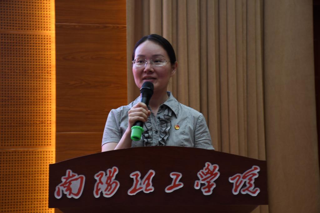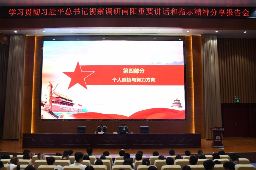 6月3日,我校团员青年学习贯彻习近平总书记视察调研南阳重要讲话和指示精神分享报告会在第三学术报告厅举办。张仲景国医国药学院张超云老师,江睿、夏天天同学分享了与总书记面对面交流的激动心情,汇报了学习贯彻习近平总书记视察调研南阳重要讲话和指示精神的感悟与心得体会,400余名团员青年参会,报告会由校团委副书记高亢主持。